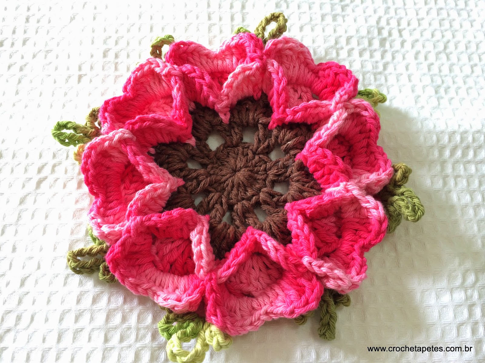 Tapete redondo com flor estrela do mar confeccionado com barbante Barroco natural e Barroco multicolor (9202-9368).