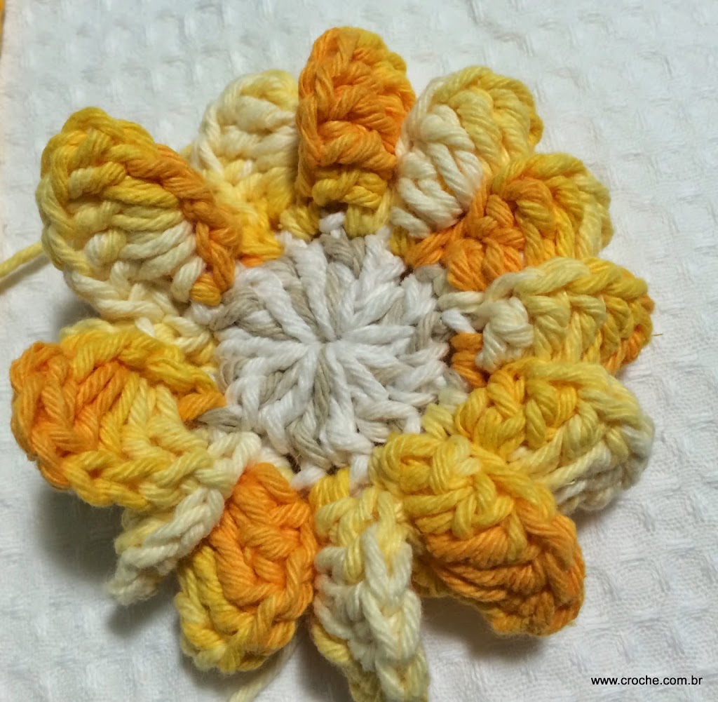 Concluindo a ultima pétala, prenda com ponto baixíssimo onde iniciamos com o barbante amarelo.