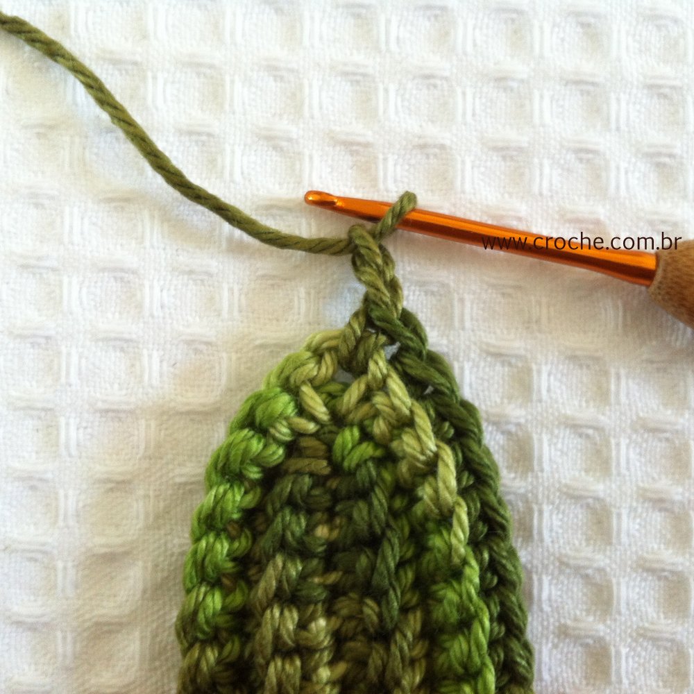11 – Para formar a próxima pontinha da folha, não chegue com ponto baixo até o final… vá até que fique sobrando 2 pontos baixo da volta anterior… faça uma corrente e vire o trabalho para voltar com ponto baixo…. Agora só repetir os passos até atingir a forma desejada da folhinha.