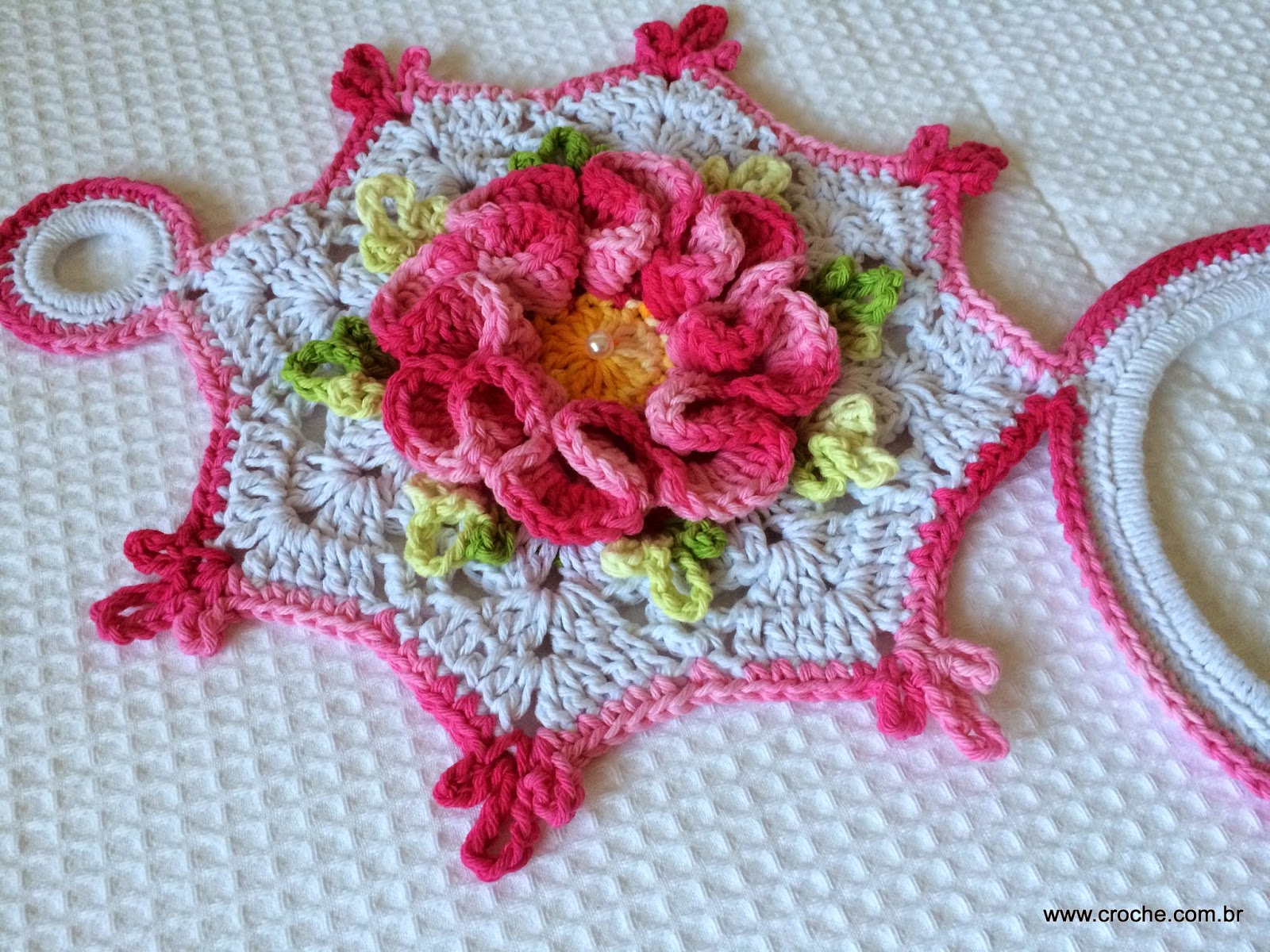 18 – Com o barbante barroco na mesma cor que utilizei para fazer a flor (fica a seu critério) amarre-o em um dos cantos. Todos os cantos fiz o acabamento da mesma forma que são feitas as folhas da flor, você pode fazer apenas ponto picô que fica muito bonito também.