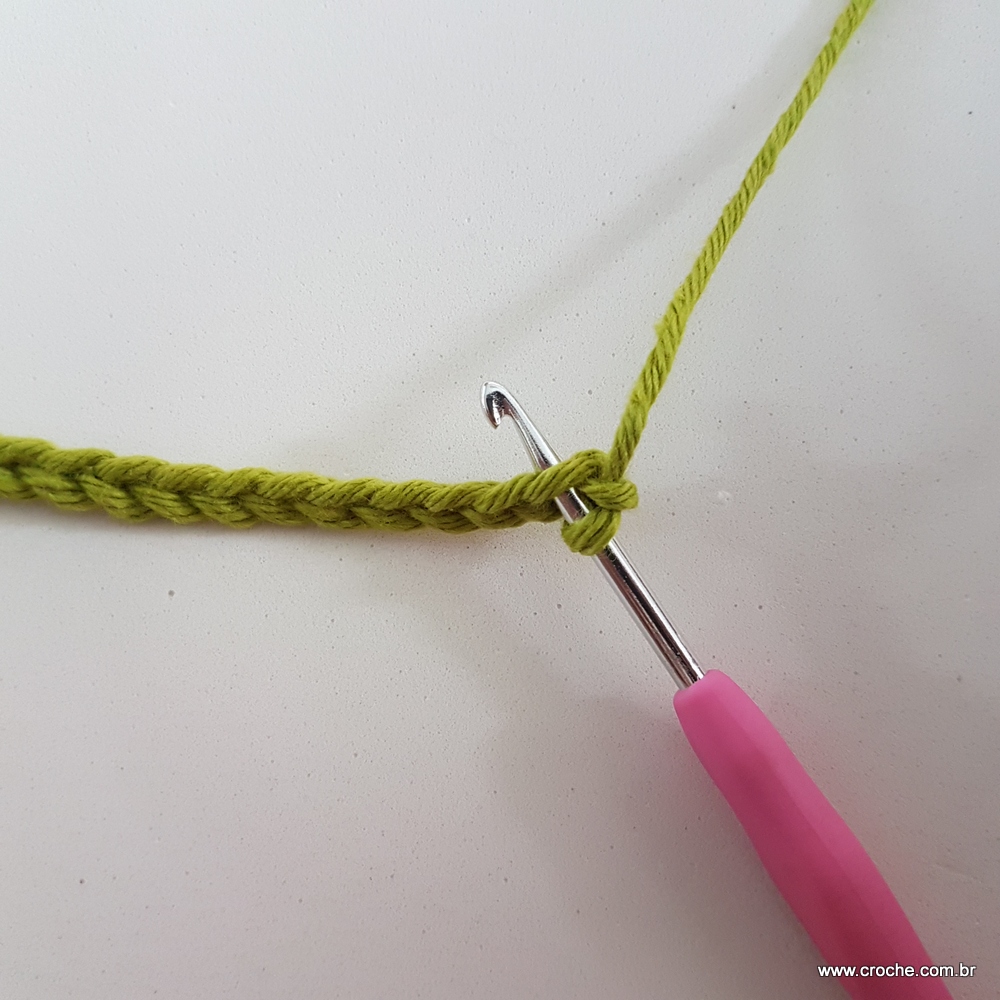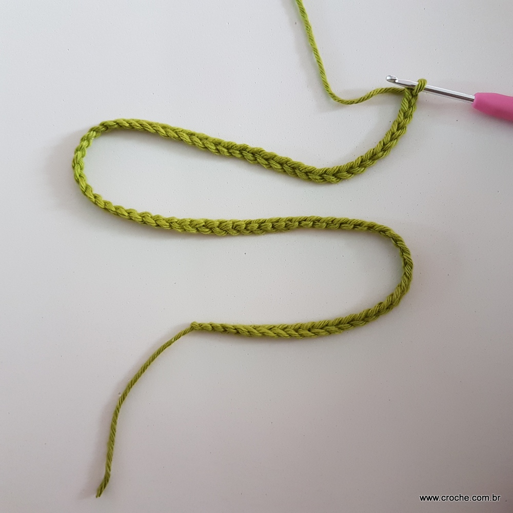 01 – Inicie o seu trabalho fazendo um cordão com 77 correntes. Volte na segunda correntinha a partir da agulha e realize o primeiro ponto baixo.