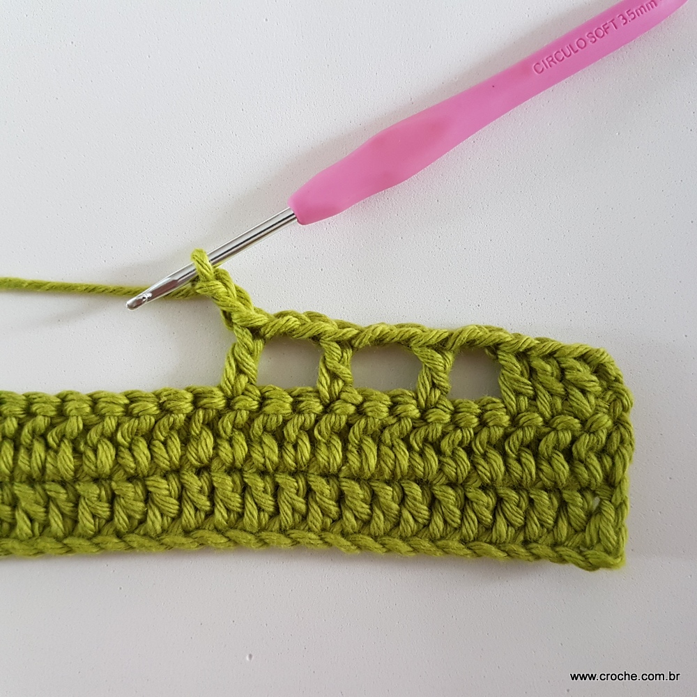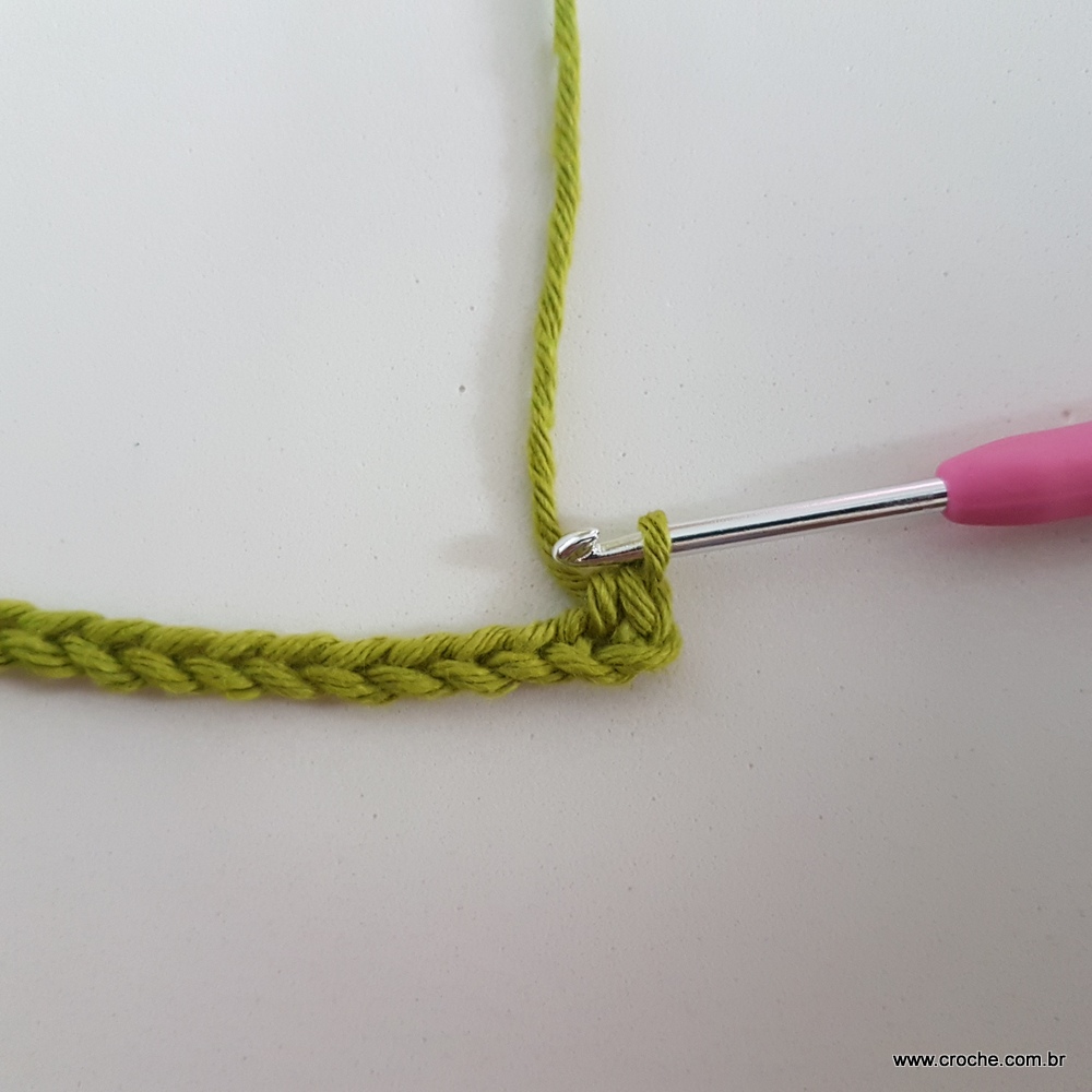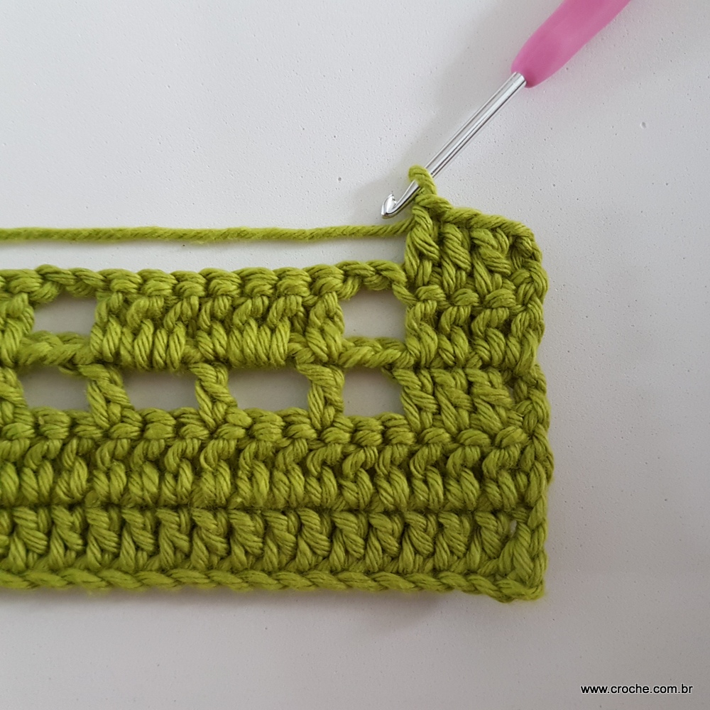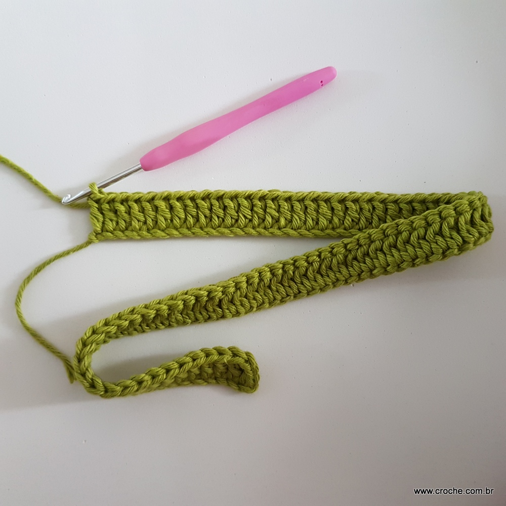 04 – Faça duas correntes, lace o fio e vire o trabalho. Volte trabalhando ponto alto sobre ponto alto em toda a extensão da carreira.