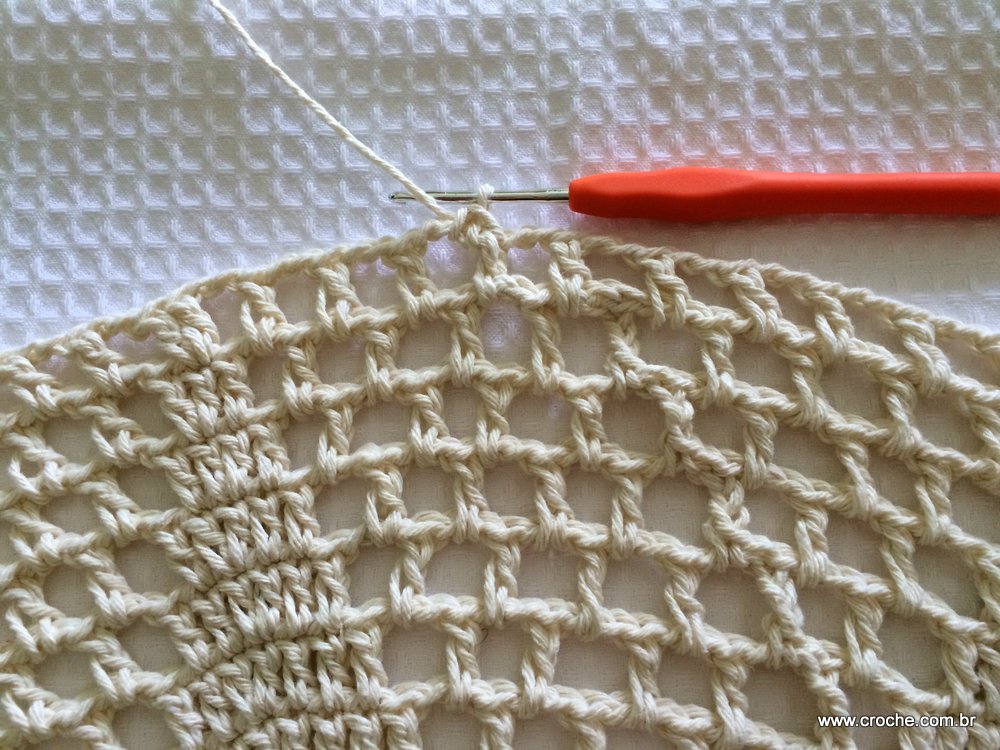 22 – Faça uma corrente de espaço e no conjunto de 10 pontos altos faça 1 ponto alto e uma corrente de espaço em todos os pontos, no total são 10 pontos altos sempre separados por uma corrente, ao final faça uma corrente e novamente trabalhe um conjunto de 6 pontos altos, duas correntes de espaço, pule um ponto de base e novamente 6 pontos altos… Siga por toda a volta e finalize com ponto baixíssimo.